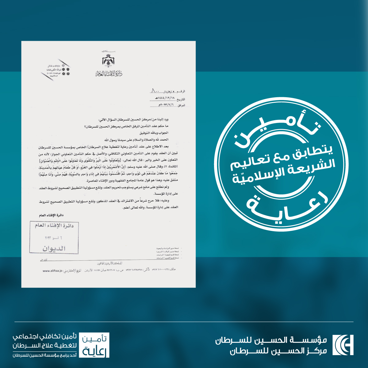 يضمن التأمين العلاج الحصري في مركز الحسين للسرطان حيث لا توجد أي جهة تأمين أخرى في الأردن تضمن العلاج في مركز الحسين للسرطان